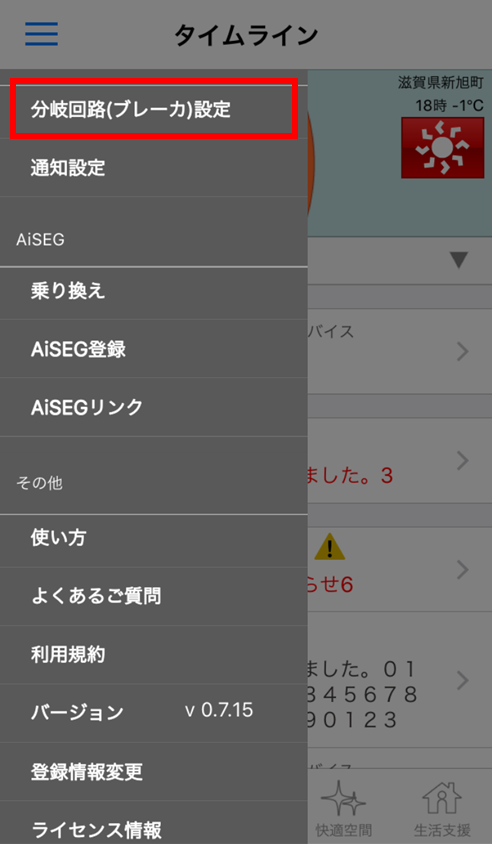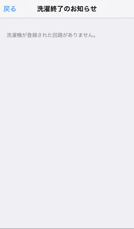 洗濯機が接続されている分岐回路(ブレーカ)が選択されていない場合は、下記のような画面が表示されます。 その場合は、メニューボタンより、分岐回路(ブレーカ)設定をしてください。