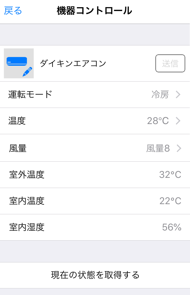 - 設定変更後、送信ボタンがタップ可能になるので、「送信」をタップすると、設定内容がエアコンに送信されます。