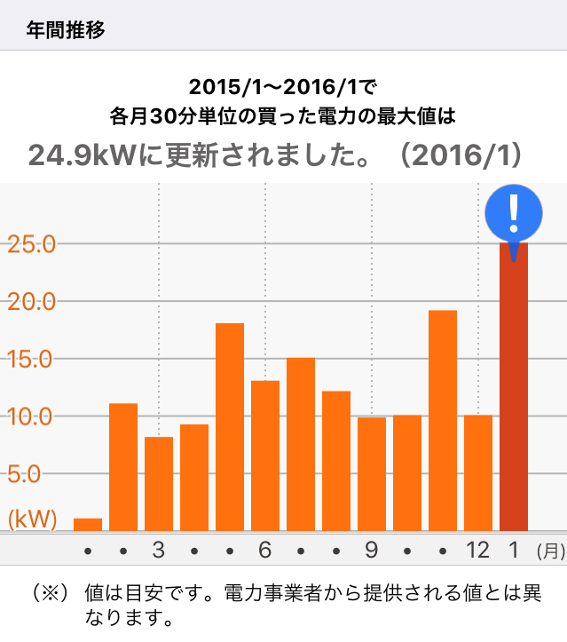 の付いたグラフは、過去13ヵ月間における、30分単位で買った電力の最大値を表します。