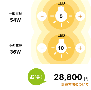 - シミュレーションは、2種類の電球で行うことができ、各電球の取替え個数を「+」または「−」で入力することで、1年間における電気代の削減額の目安を表示します。