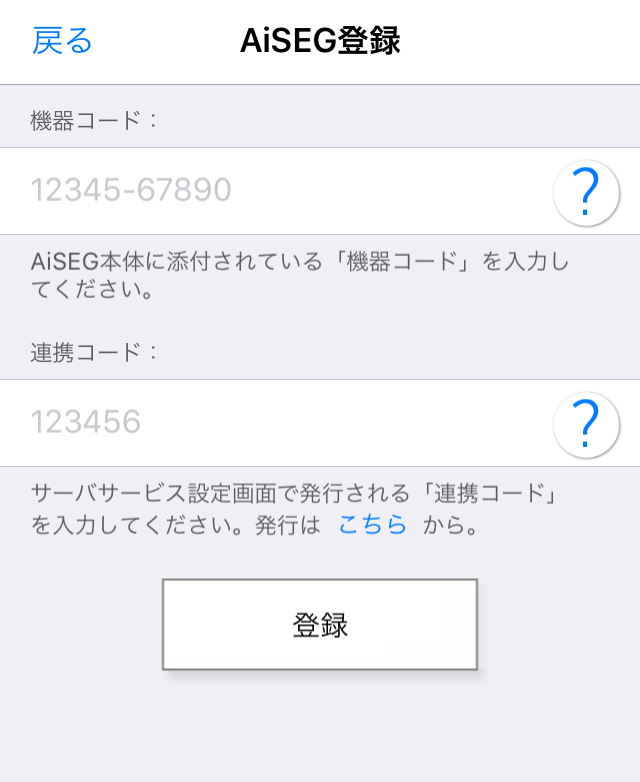 メニューからAiSEG登録を選択し、利用規約に同意していただくと下記画面に遷移します。