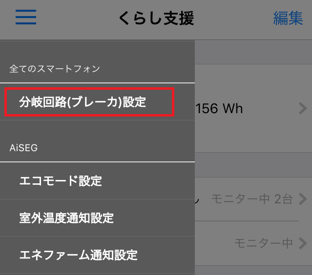 洗濯機が接続されている分岐回路(ブレーカ)が選択されていない場合は、下記のような画面が表示されます。 その場合は、メニューボタンより、分岐回路(ブレーカ)設定をしてください。