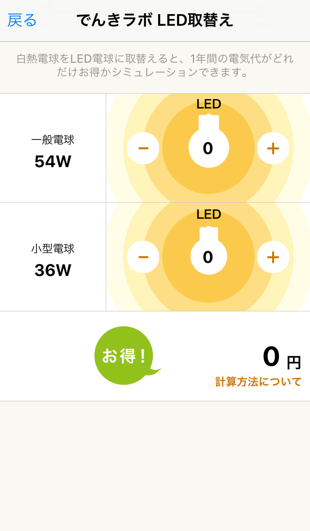 白熱電球からLED電球に取替えた場合、電気代がどの程度削減できるかをシミュレーションします。