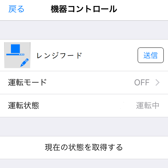 - 送信ボタンがタップ可能になるので、「送信」をタップすると、設定内容がレンジフードに送信されます。