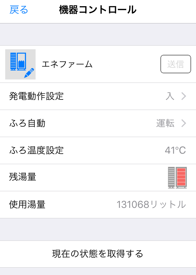 操作したいエネファームの表示をタップすると、操作画面が表示されます。