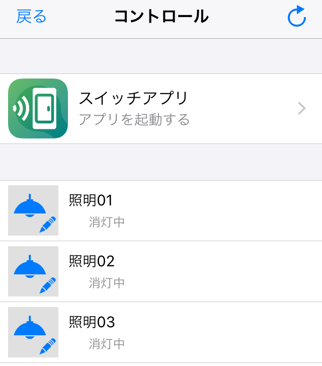 照明の表示をタップすると、スイッチアプリの起動画面と個別の照明の状態が表示されます。