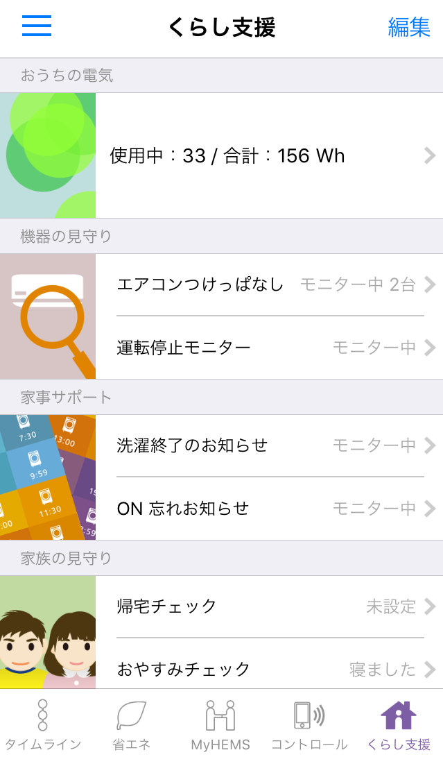 - 「グループの並び順編集」では、「おうちの電気」、「機器の見守り」、「家事サポート」、「家族の見守り」、「便利なお知らせ」のカテゴリの並び順を編集できます。