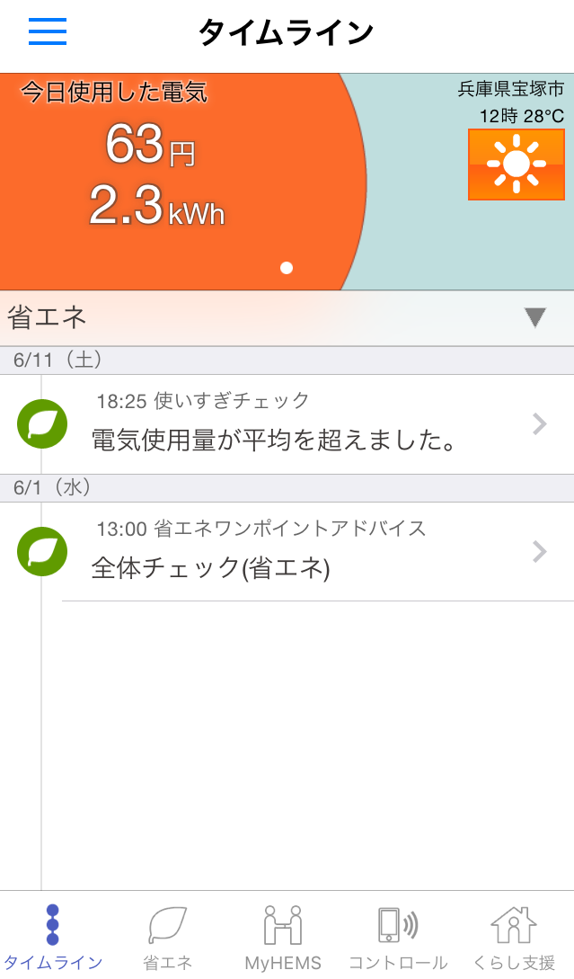 ※タイムラインのトップ画面は、電力計測装置(スマートコスモ/計測ユニット/スマートメータ)、天井埋込型空気清浄機のいずれも登録されていない場合、天気予報のみが表示されます。