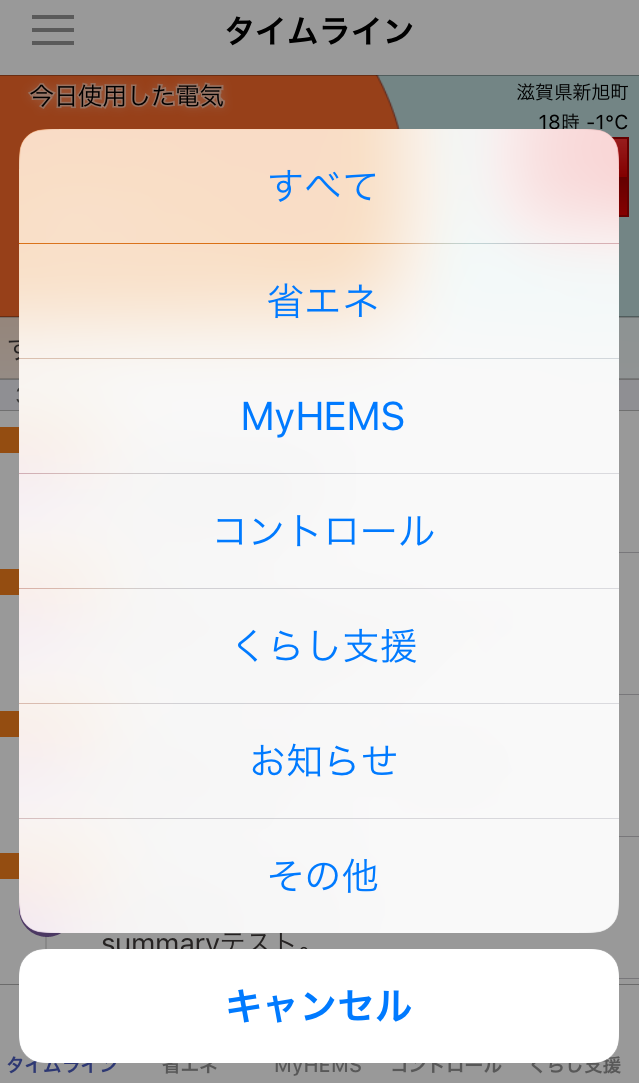 通知設定画面では「使いすぎチェック」のプッシュ通知の有効・無効の切り替え、有効の場合の通知時間の設定、「ワンポイントアドバイス」の有効・無効の設定、他の各種通知設定ができます。 - タイムラインのメッセージは「すべて」「省エネ」「MyHEMS」「コントロール」「くらし支援」「お知らせ」「その他」のカテゴリーを選択して表示することが可能です。