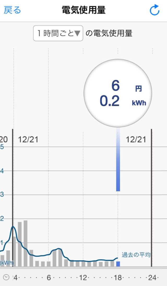 グラフ部分をフリックすることで、過去の電気使用量を見ることができます。