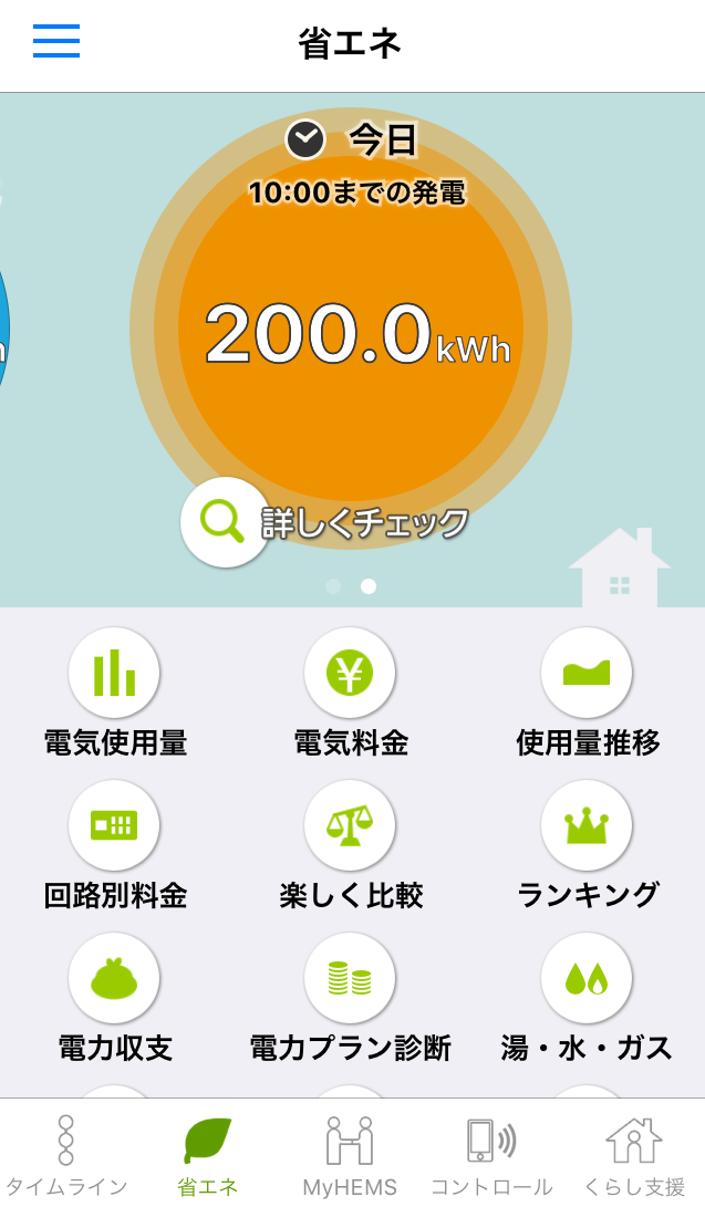 「今日の電気使用量」または「発電量」の表示部をフリックすることで、表示が切り替わります。