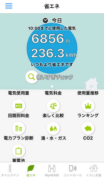 本日 0:00 から取得可能な最新の時間までの、電気使用量、電気料金が表示されます。