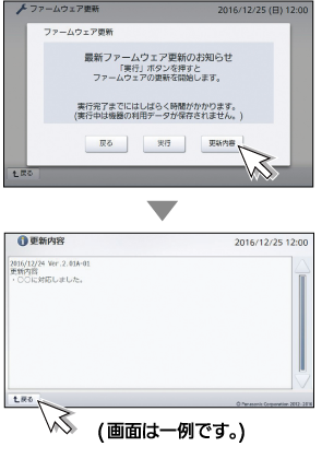 - (注)ファームウェアの更新に失敗した場合、「ファームウェア更新に失敗しました。お知らせ画面を確認してください。」が表示されます。