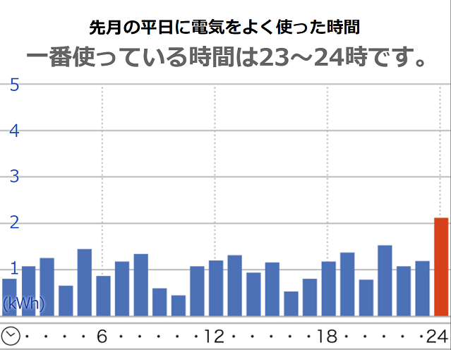先月の月〜金曜日に電気をよく使った時間帯が2種類のクラフで表示され、どの時間によく使ったかがわかります。