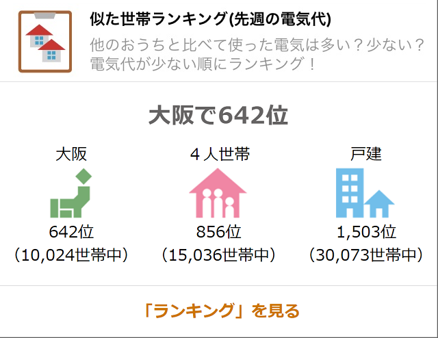 似た世帯における、先週1週間の電気代の順位を表示します。