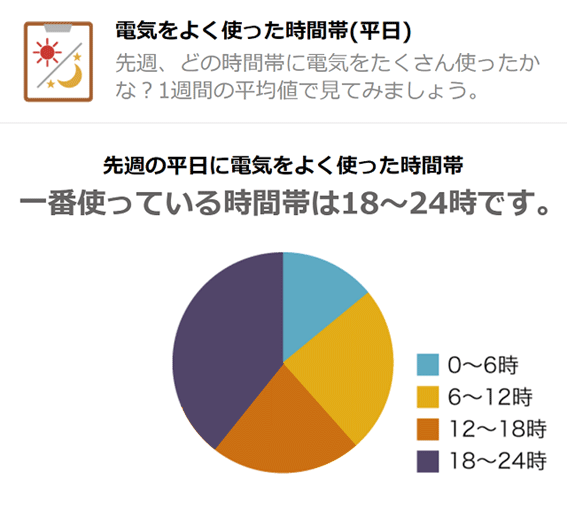 先週の月〜金曜日に電気をよく使った時間帯が2種類で表示され、どの時間によく使ったかがわかります。