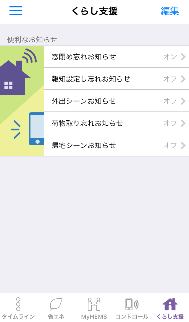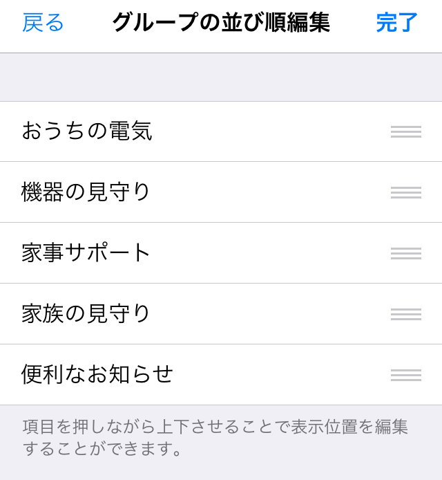 - 「グループの並び順編集」では、「おうちの電気」、「機器の見守り」、「家事サポート」、「家族の見守り」、「便利なお知らせ」のカテゴリの並び順を編集できます。