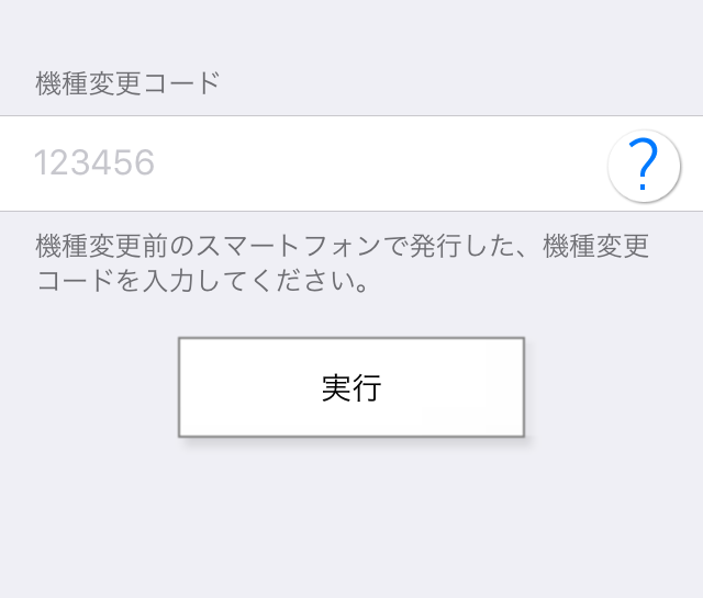 - 「[1]機種変更コードの発行手順」で発行した「機種変更コード」を入力し、実行ボタンをタップします。