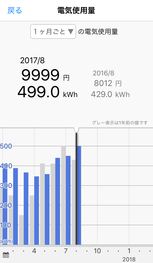 グラフ部分をフリックすることで、過去の電気使用量を見ることができます。
