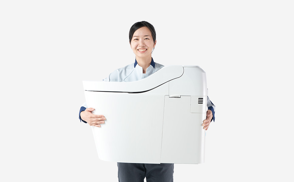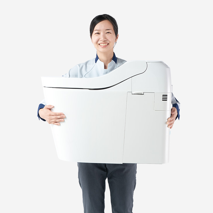 便器本体は約18㎏で、従来の陶器製便器の約半分の重さ。ひとりでもラクに搬入でき、施工時間の短縮や作業負担の軽減につながります。