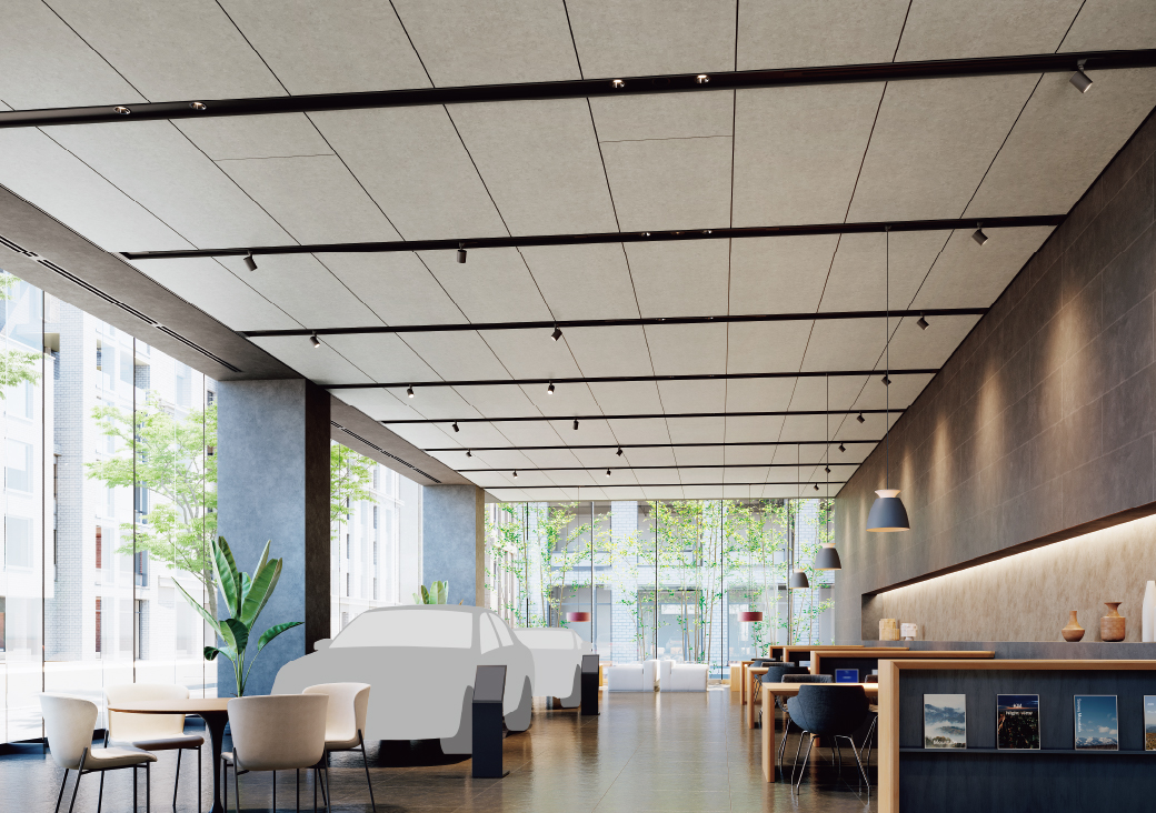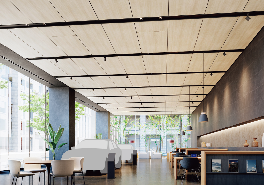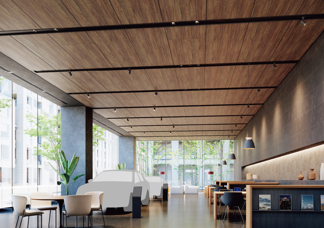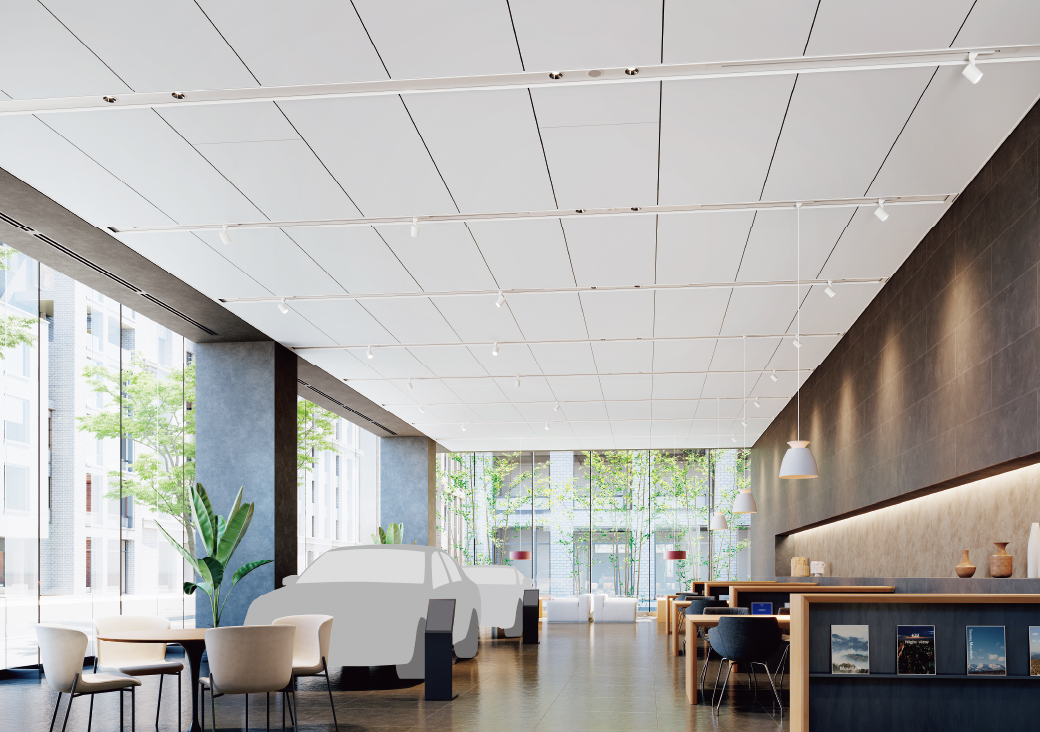 特定天井として該当しない商業施設にも。 軽量天井で空間の安全性を高めつつ、商品や空間が映える天井に。ダクトレール仕様の設備ラインならライティングもフレキシブルに対応できます。