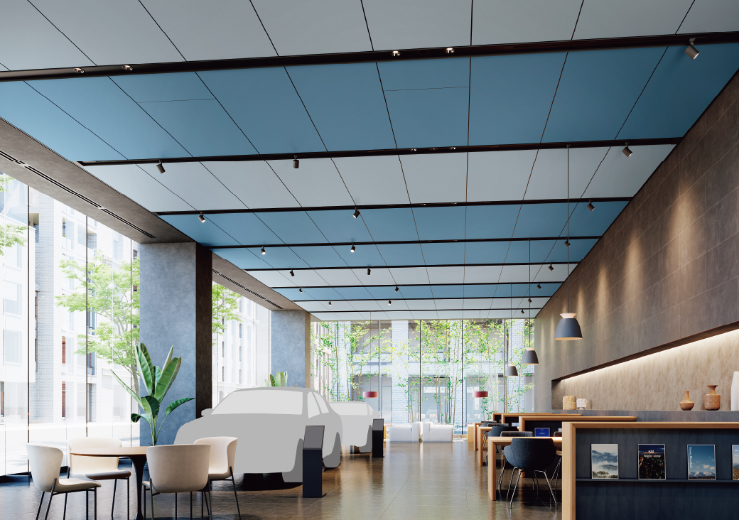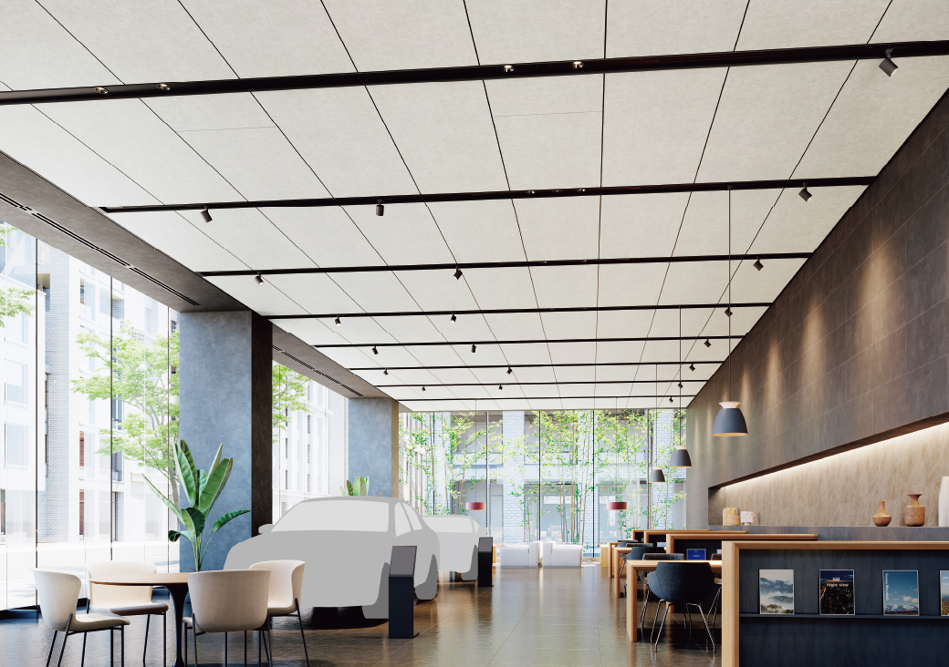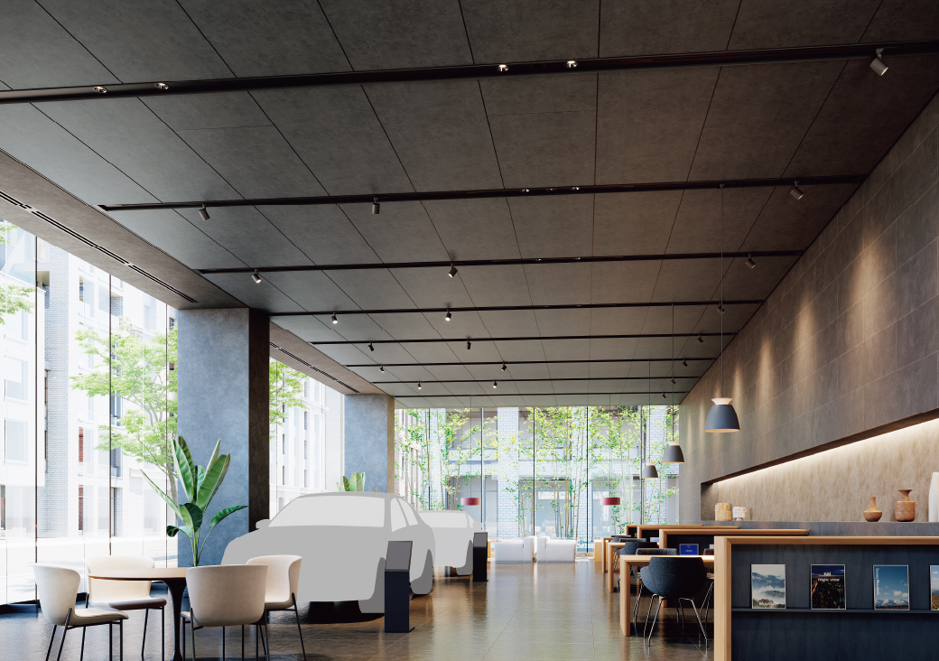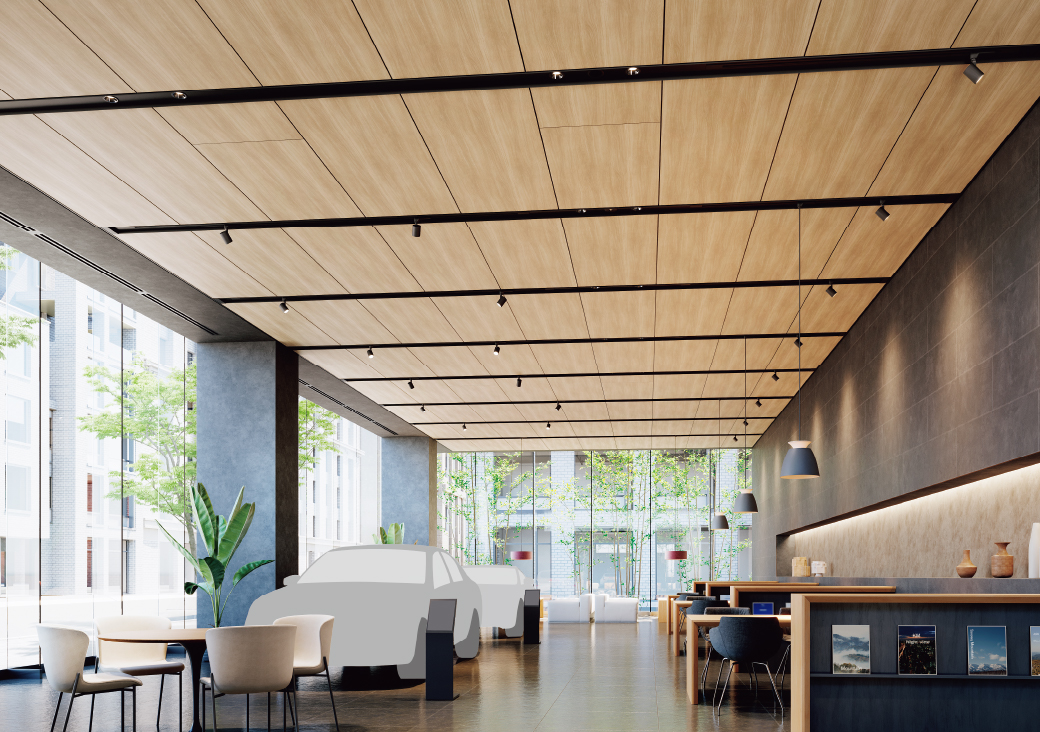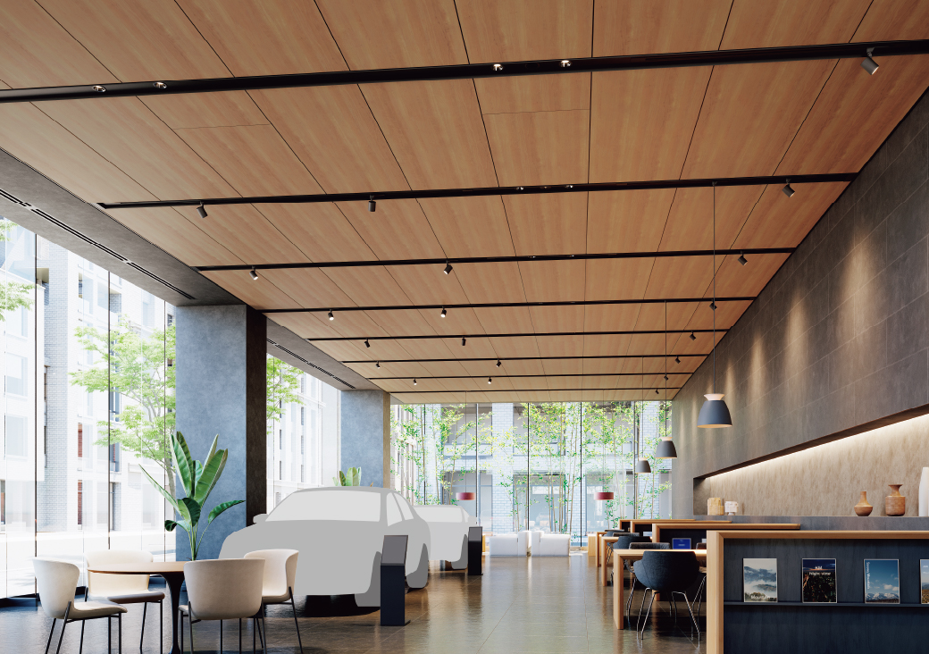 特定天井として該当しない商業施設にも。 軽量天井で空間の安全性を高めつつ、商品や空間が映える天井に。ダクトレール仕様の設備ラインならライティングもフレキシブルに対応できます。