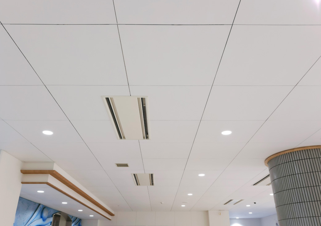 文教施設の特定天井の改修工事において、追加ブレース工事ができず、現場がストップ。期日が迫る中で、既設の設備配管を避けることができるのがエアリライトであったため採用となりました。