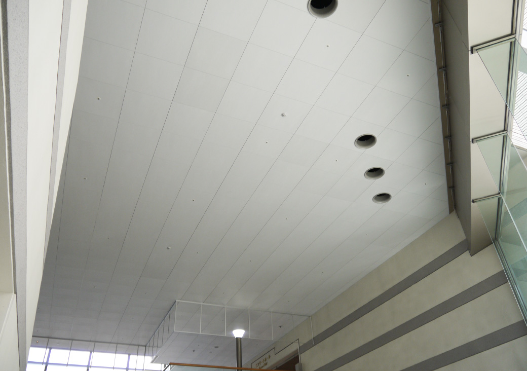 他商材の軽量天井材は、目地部のフレームが目立ってしまうのに対し、エアリライトは4mm幅の奥目地になっており、スッキリして見える意匠を気に入りました。 専用下地ではなく、一般の鋼製下地で施工が出来るため、特定天井で2キロ/m2以下に納める設計も楽に行えました。