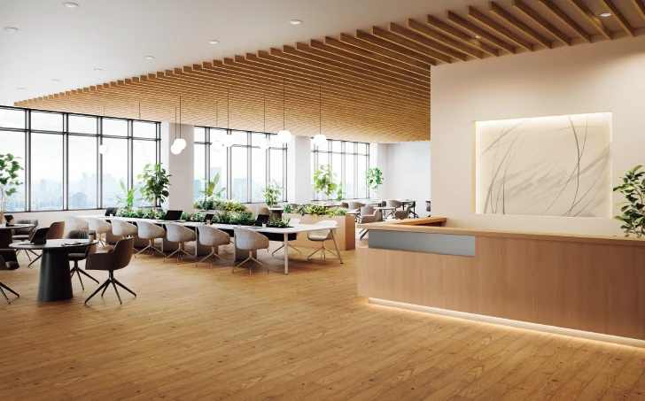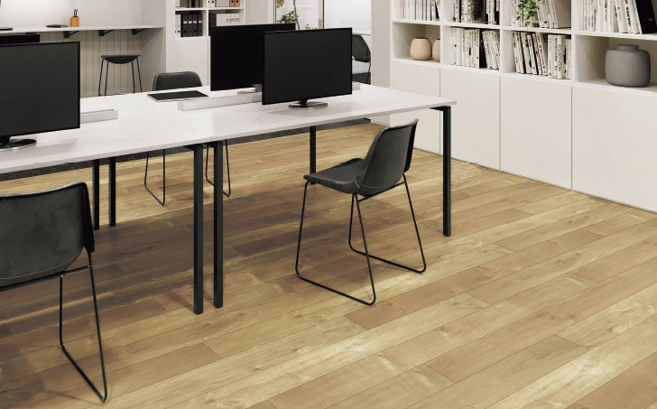 OAフロアやコンクリートスラブ、捨貼合板に施工可能。オフィス・商業施設に求められる性能を持ち合わせた木質仕上げ材です。