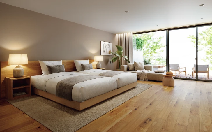 宿泊施設に必要な防音性能を備えた天然木直貼り床材です。3樹種9色のラインアップで、幅広い空間コーディネイトに対応できます。