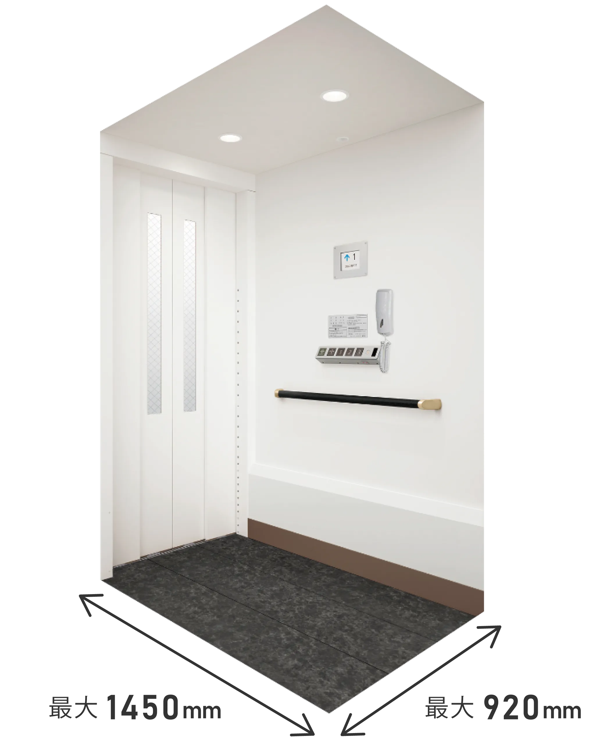 「ホームエレベーターは用途制限を受けてしまう」「業務用エレベーターでは設置が大変」 。そんな小規模建築物におすすめなのが、小型エレベーター。シンプルな構造だから、省スペース設計、短工期、低コストの設置費・維持費で、木造建築物にも対応します。