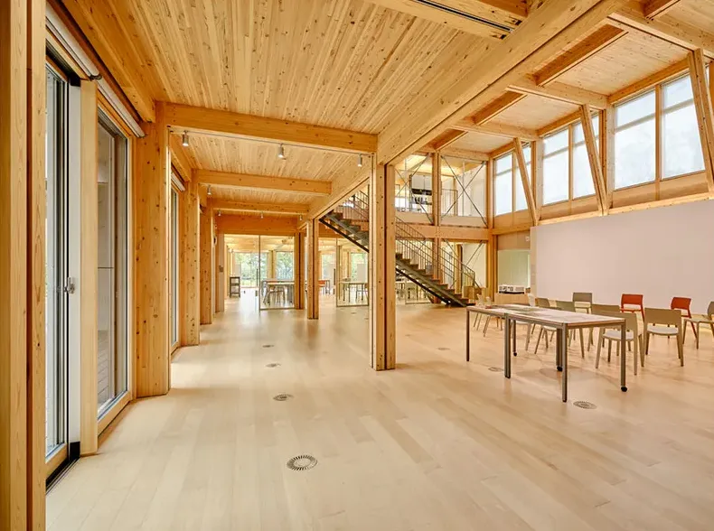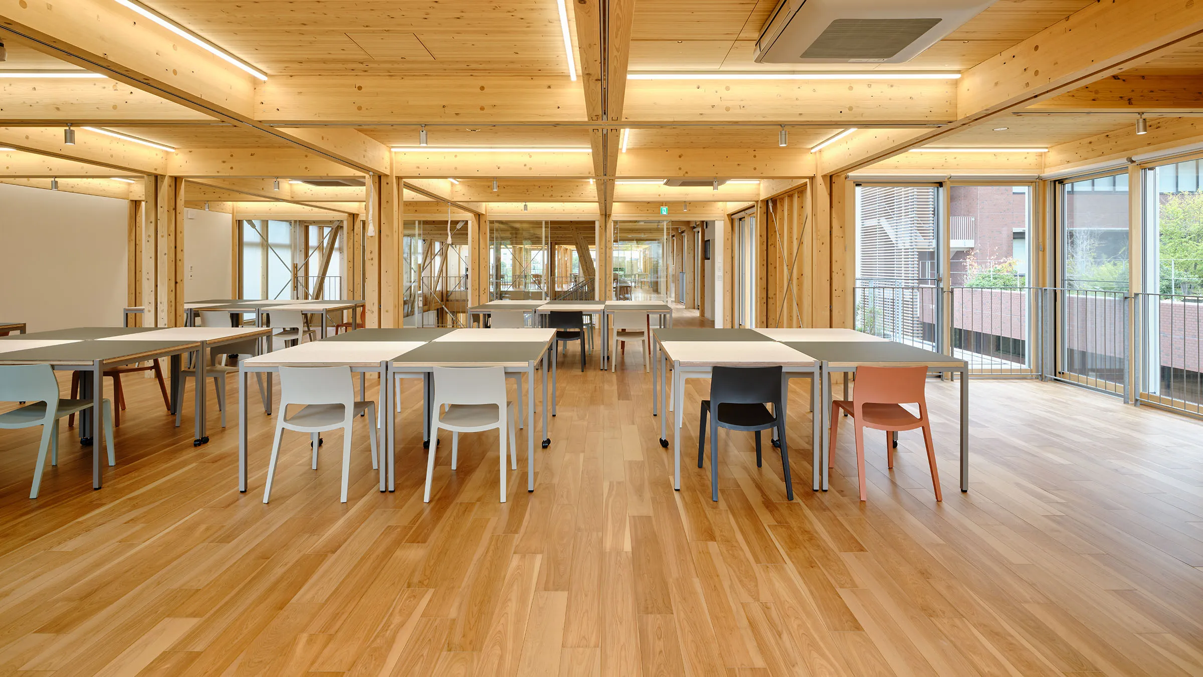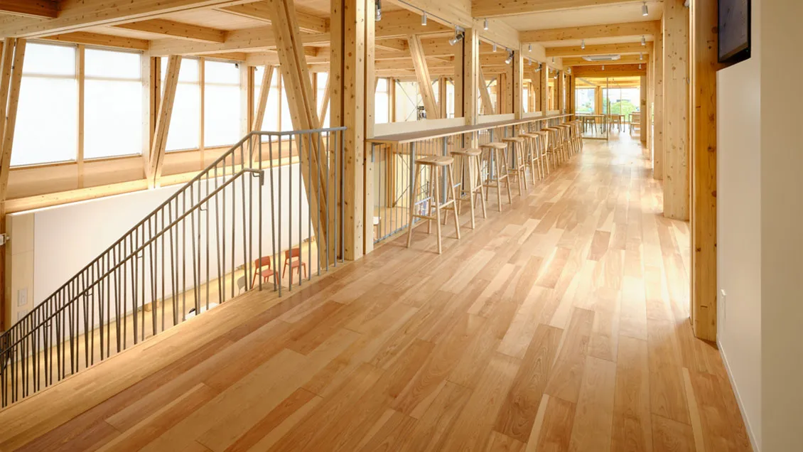 学生の皆さんに木の空間の良さを最大限感じてもらうため、柱・梁・壁・天井の仕上げを最小限として“木”を現し、ヒノキ・スギの製材や集成材、合板なども適材適所で取り入れています。そんな空間の中で、周囲の部材に負けないためには床材にも高い意匠性が必要でした。