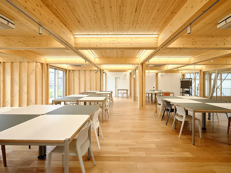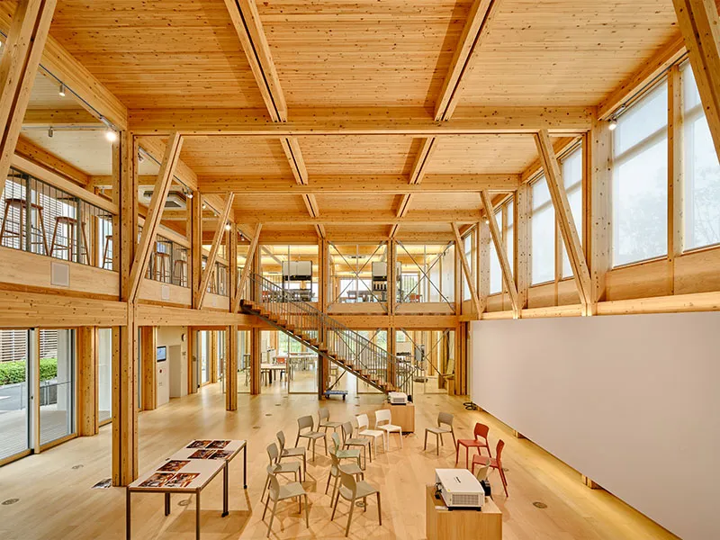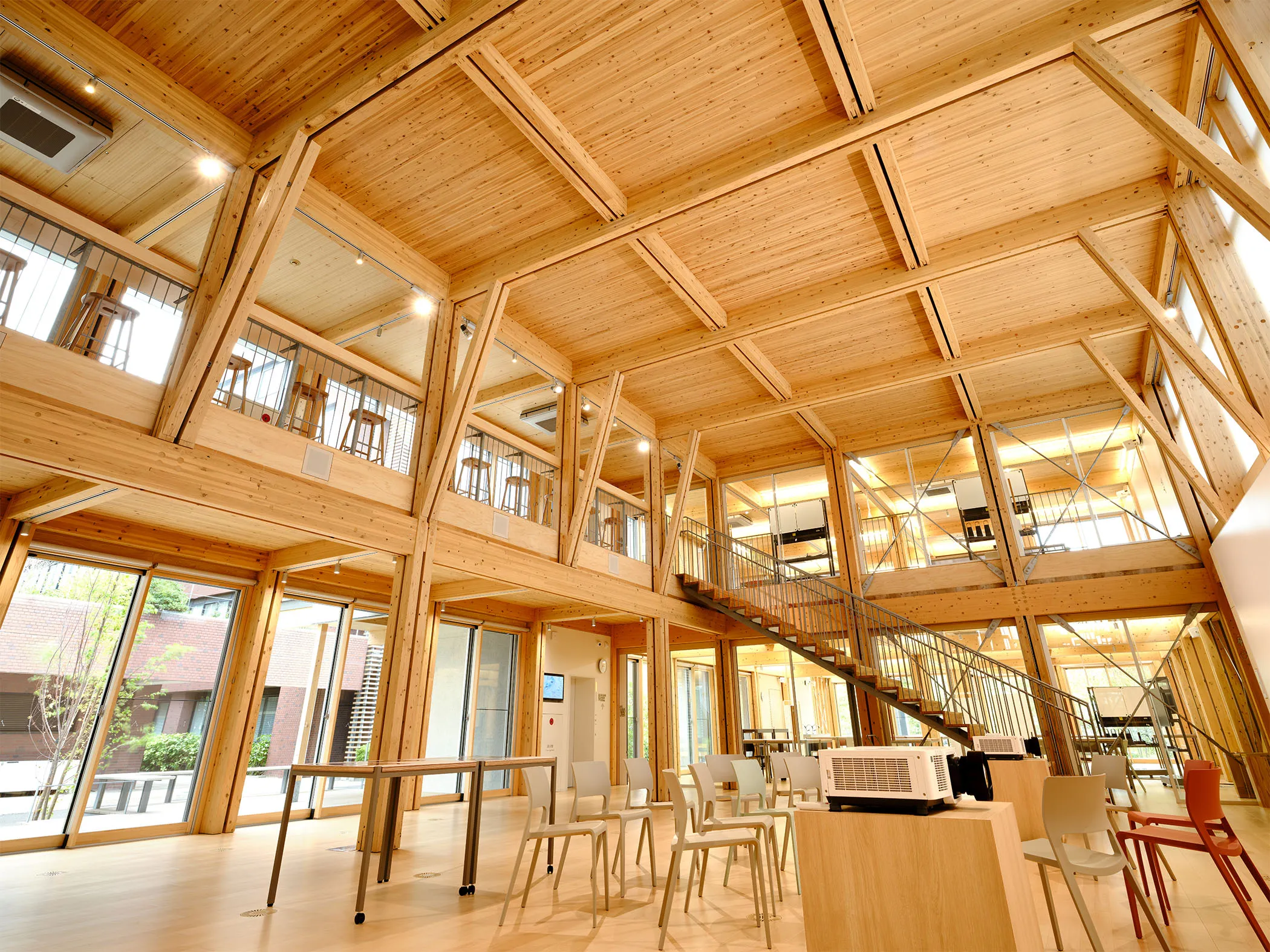 2025年9月に竣工。天然木の美しさを最大限生かした建築と、各教室がシームレスにつながる開放的な空間設計で、多様な分野の学生が集う「環境共生学部」の特性を体現している。
