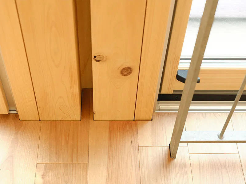 貼り剥がしのしやすさのためとはいえ床材本体が薄いので、当初は「このような柔軟な薄い材料で大丈夫か?」と思っていたのですが、貼ってみると思った以上にしっかりしていて、厚みも感じられる仕上がり。柾目だけでなく板目が複数入っていることでランダム感が生まれ、自然な仕上がりになったと思います。1階のホールには無垢材を使っていますが、そちらと比べても遜色のない見た目だと思います。