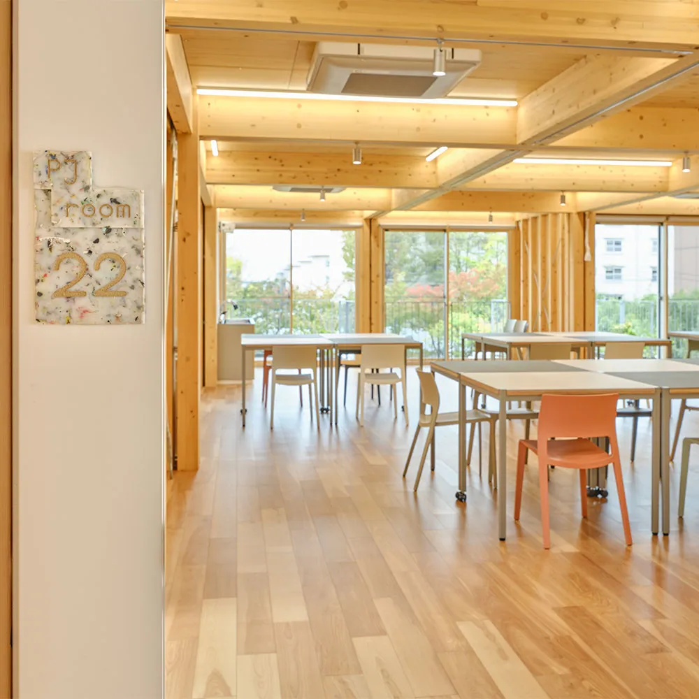 プロジェクト棟は、キャンパスで初めての木造校舎。あたたかみや香りなど、学生に木の空間の良さを身近に感じてもらうために、素材には「本物の“木”の意匠」が強く求められました。加えて「環境共生学部」は、環境共生をテーマに多彩な分野の学生や教員が集う学部。座学の他、実験・製作・フィールドワークなど活動内容が多岐にわたるため、プロジェクトルーム(教室)には様々な使い方に対応できる可変性も必要でした。竣工後も設備改修がしやすいよう、2階の教室にはOAフロアが採用されましたが、その仕上げ材にも、周囲の木に負けない意匠と質感が必要でした。