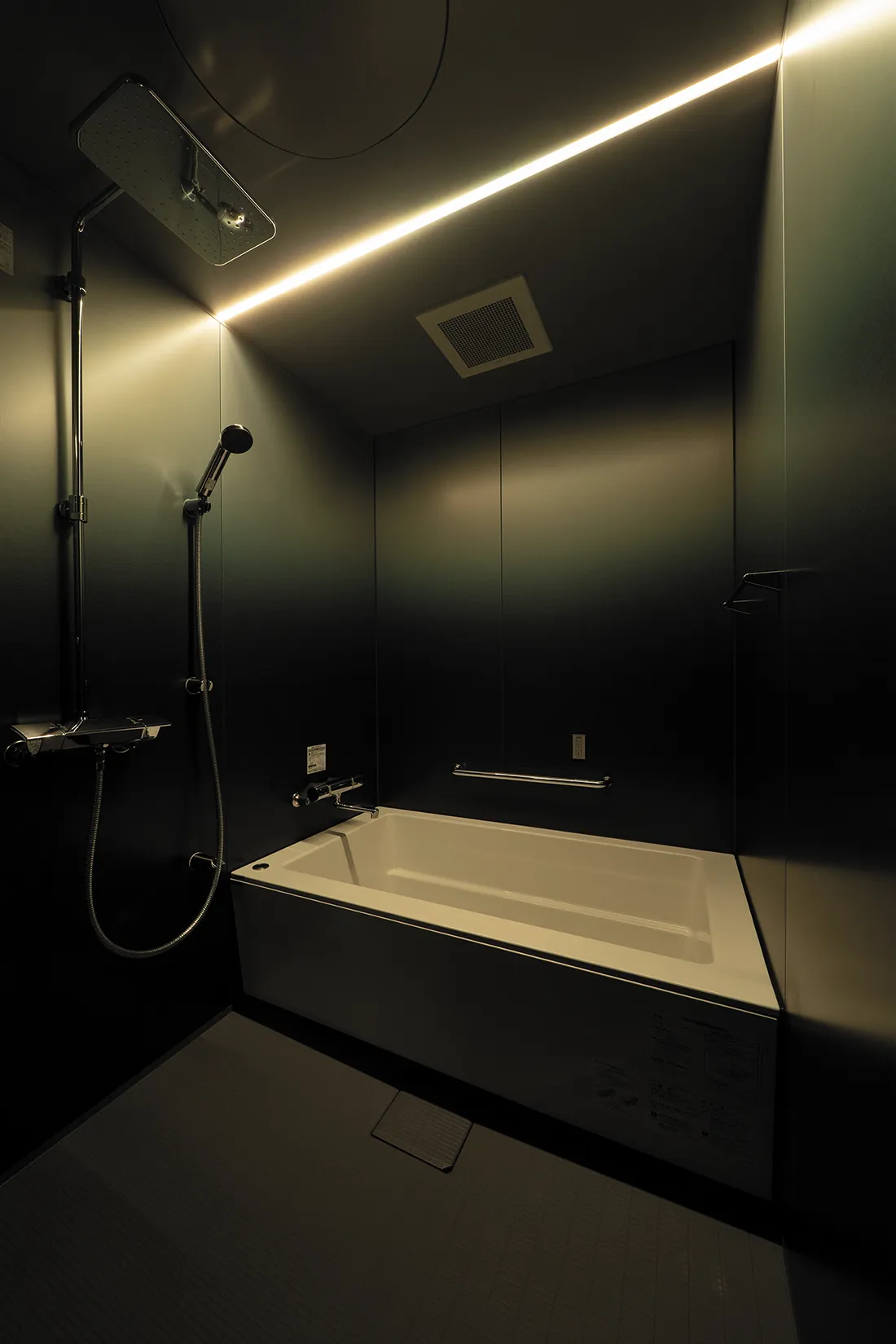 照明は天井の間から光が差し込むような印象を与え、シャープさと開放感を両立したバス空間を志向した。写真は2700Kで調光