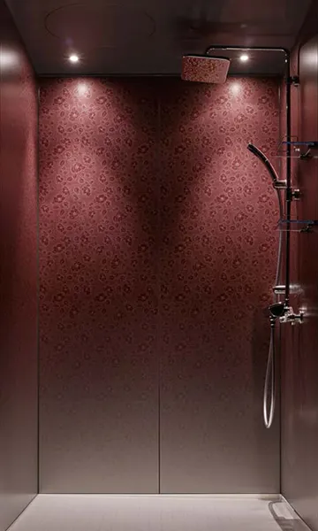 同社デザイナーの吉迫亮我は「i-X INTEGRALはプロダクトデザイナー・深澤直人氏が手掛けたi-Xを源流としています。特徴としては、壁面デザインをすべて抽象柄にしたこと。ホテルに採用された『DEEP-紺碧』は、水面から深海へ降り注ぐ光をグラデーションで表現し、インクジェット技術で微細な色の変化を描きだしました。シャワーの立ち姿勢では淡く、バスタブに浸かるとより深い色に見えるように計算されています。こうした入浴する方の心理状態までを考慮した色柄をそろえました」と説明してくれた。