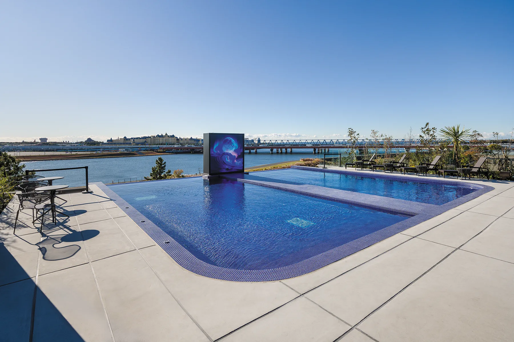 屋上のインフィニティープールから舞浜・浦安エリアを一望するPremium hotel MONday 舞浜ビューⅠがオープンした。企画を担当した第一リアルターの岡哲平さんは「都心から30分圏内でありながら、リバービューと東京ディズニーリゾートの景観を眺める開放感のある立地を生かし、インフィニティープールや大浴場・サウナを設け、都心から近いリゾートフルな体験を提供するデスティネーション型ホテルを目指しました」と話す。
