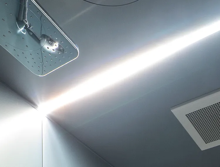 「INTEGRAL の設計思想には“陰翳礼讃”があります」と語るのは、パナソニック ハウジングソリューションズの商品マーケティング担当・片上香里。従来のバスルームが隅々まで均一な明かりを基本としたのに対し、i-X INTEGRALはライン照明による調光・調色を採用し、光と影が生む奥行きの中でのくつろぎを提案した。