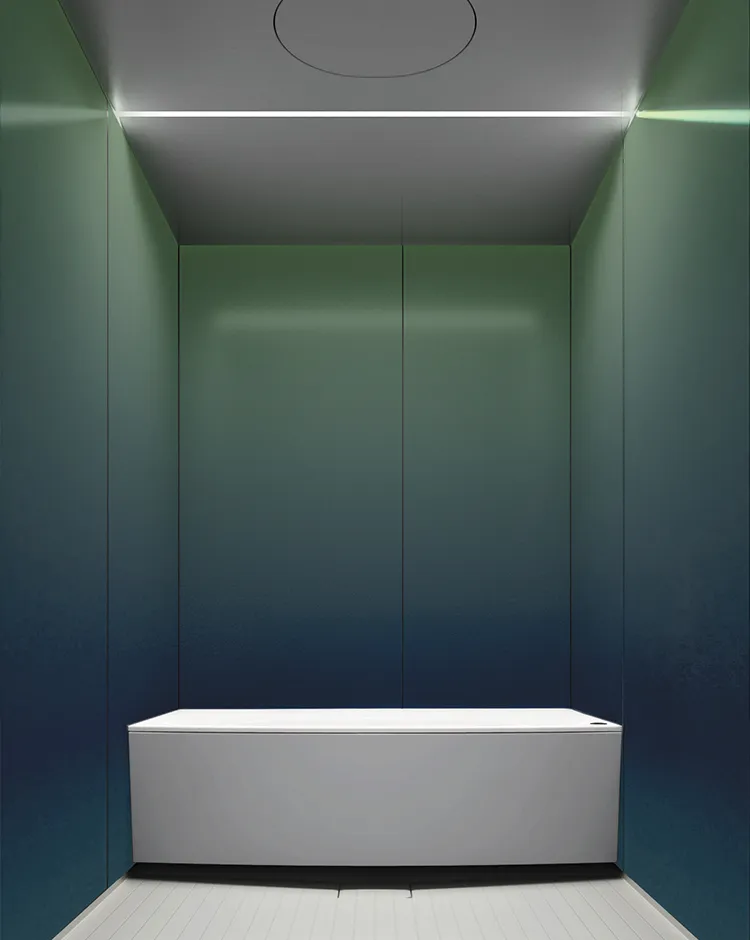 天井に設置された調光・調色機能付きの「Flat Line LED」が空間全体を照らし出す。グリーン/紺碧色の壁面はメタリック鋼板の上にUV硬化インクでジェットフルカラー印刷を施したもの。写真は4000Kで調光