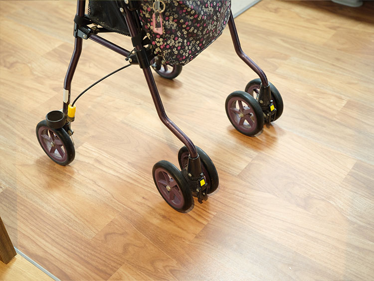 そのためこの施設は、万が一のために衝撃吸収フロアー「クラウドステージ」をすべての居室に敷いています。クッション性の高いフロアーは通常歩行の時に沈み込みが感じられ少し違和感があるものもあるようですが、体重のある私でも通常のフローリングと同様の感触で、「クラウドステージ」の居室から廊下に出た時でもその違いに気づかないほどです。杖やシルバーカーをご使用の方でも、通常のフローリングより歩きにくいといったお声もないようで、何より通常のフローリングに見えることがQOL(Quality of Life)※2の面からもいいと思います。