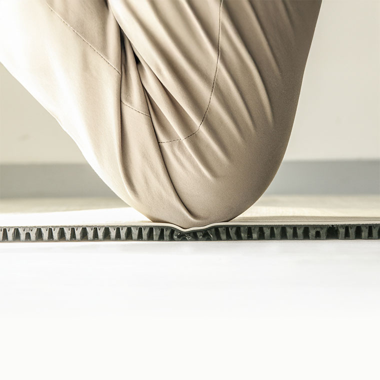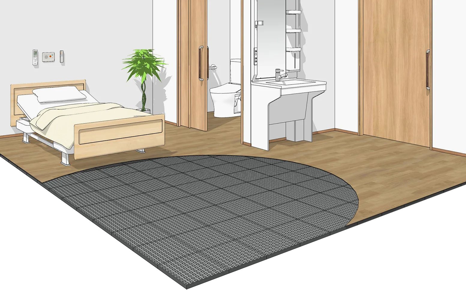 転倒時における高い衝撃吸収性とフローリングに近い歩行感の両立を実現。利用者様の転倒への不安や、介護現場が抱える見守りの負担軽減に貢献します。