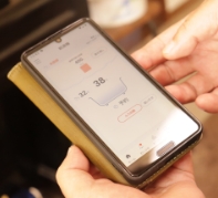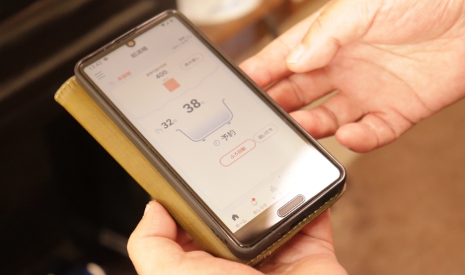 専⽤アプリ「スマホでおふろ」は娘が初期設定してくれましたが、遠隔でお湯はりができとても重宝しています。さらに、毎朝前⽇の使⽤湯量が届いたり、タンクの残り湯量もすぐに確認できて便利です。家族が浴室にいるとき、「⼊室中」の表⽰が出るのもいいですね。