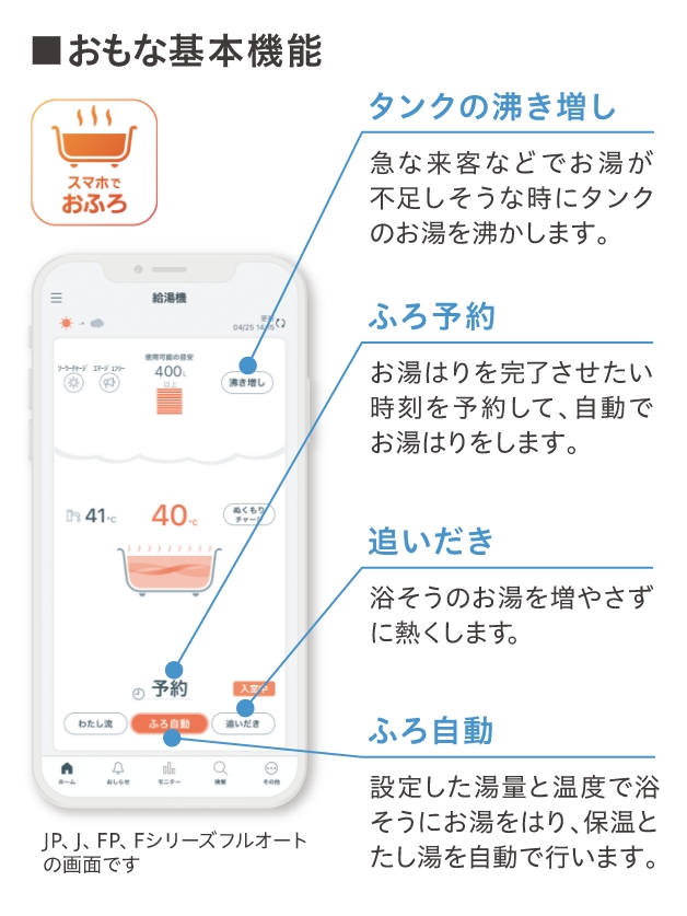 専⽤アプリ「スマホでおふろ」は間違いなく便利ですので、設置時にご紹介をしております。スマホの画⾯もリモコンも、「シンプルで⾒やすい」と思います。