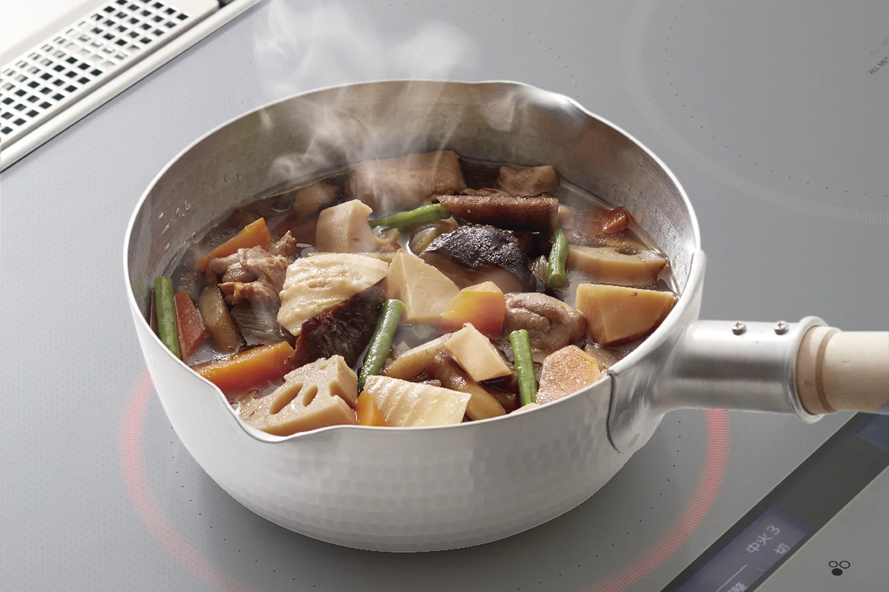 アルミ製の鍋は熱伝導性が非常に高く、食材をすばやく均一に加熱できます。鍋全体に熱がムラなく伝わるため、煮込み料理も効率よく火が通り、調理時間の短縮につながります。