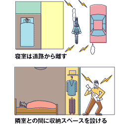 寝室や書斎は、車の通行が多い道路から離したり、