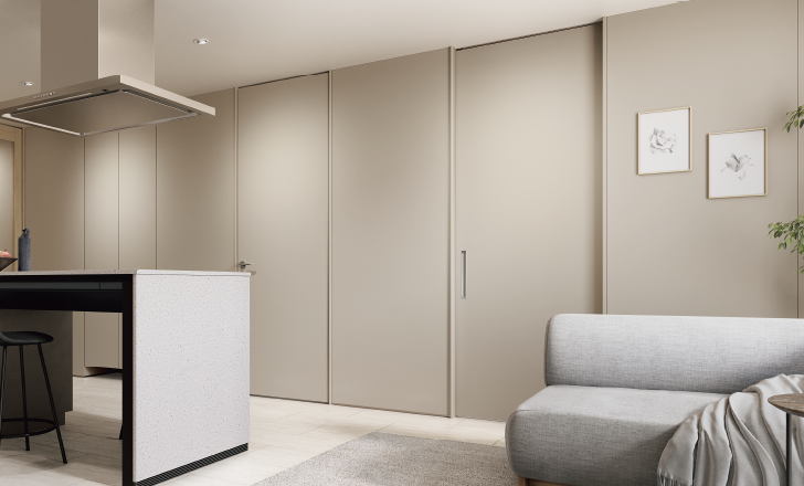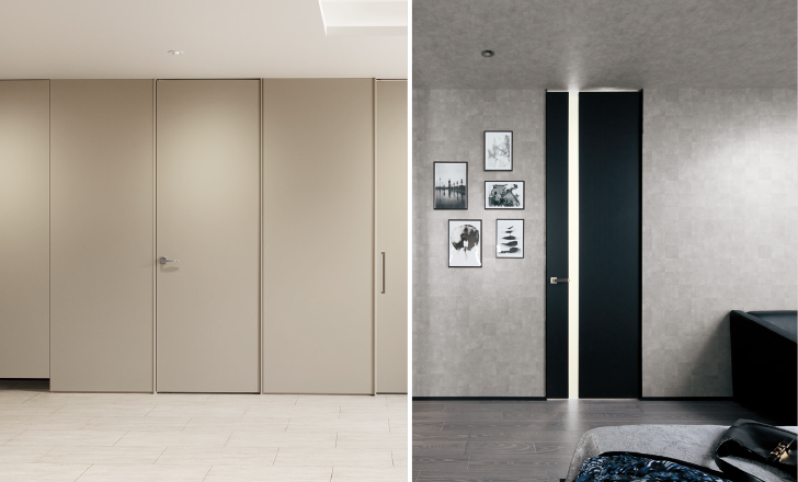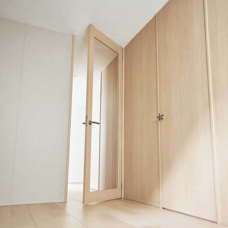 2方枠仕様なら、ドアの前後の天井面がフラットにつながり、開放感のある空間になります。金具が見えない隠し蝶番ならさらにすっきり。
