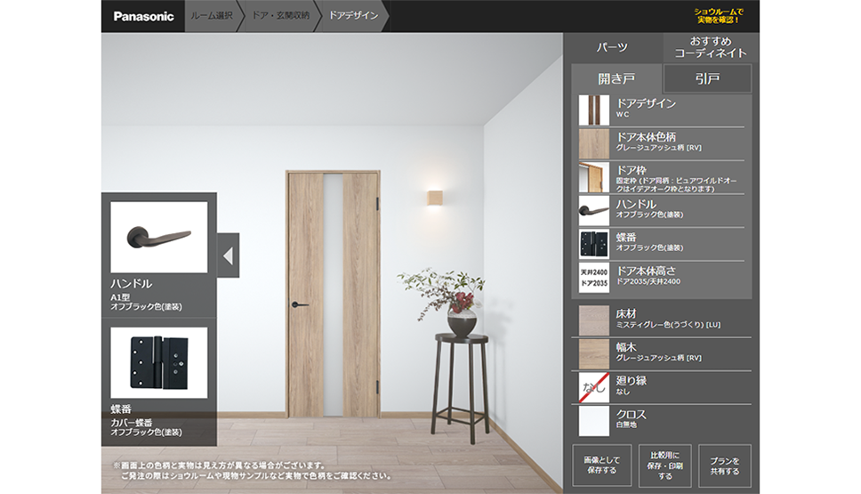 ドアのデザインや色、枠や金具を自由にコーディネイトできる「カラーコーディネイション」。床や幅木の色を変更して、部屋のイメージも確認できます。ドア選びにお役立てください。