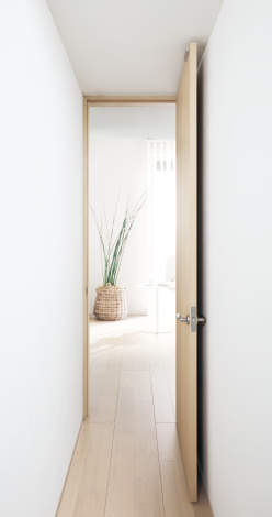 扉を閉めると蝶番やラッチ受けなどが見えない、すっきりとした納まりへの変更をsオーダーで対応します。