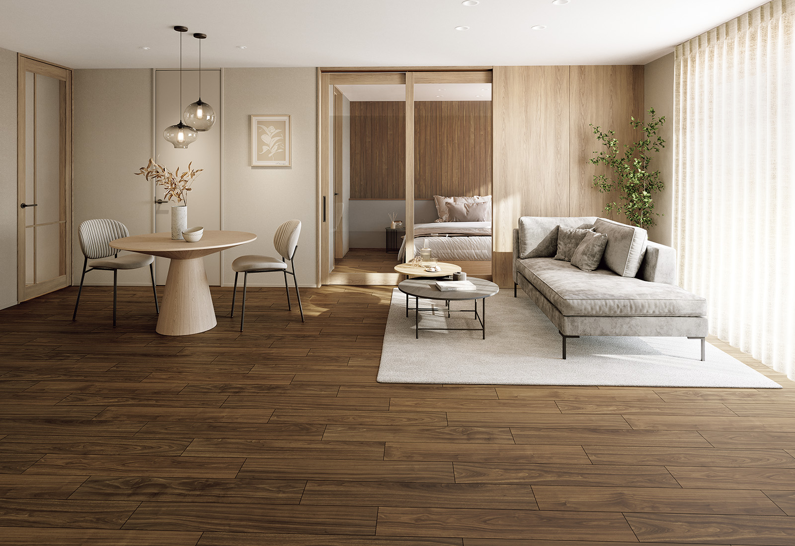 - ●複数の柄パターンで、ムクの風合いと深みを表現します。施工時には仮並べを行い、部屋全体の色・柄のバランスをご確認ください。